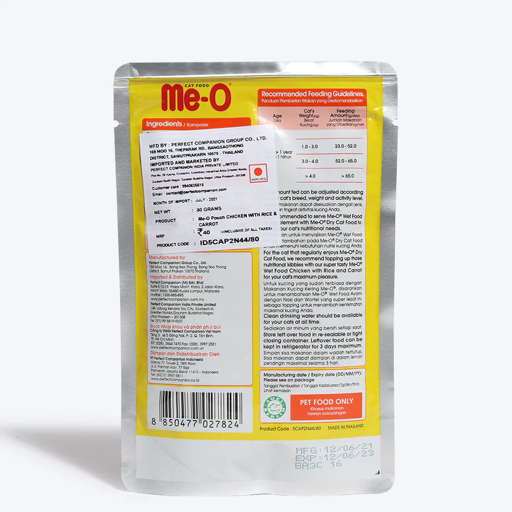 ME-O Chicken and Rice and Carrot contains calcium phosphorus for strengthening teeth and bone. It contains Vitamin D which helps in improving the skin and fur and hence, provide a shinny fur. ME-O Chicken and Rice and Carrot contains chicken for healthy muscles as it has high protein and Carrot as a source of fibre which helps digestion.ME-O Chicken and Rice and Carrot Pouch contains Taurine that helps in improving the eye sight.
