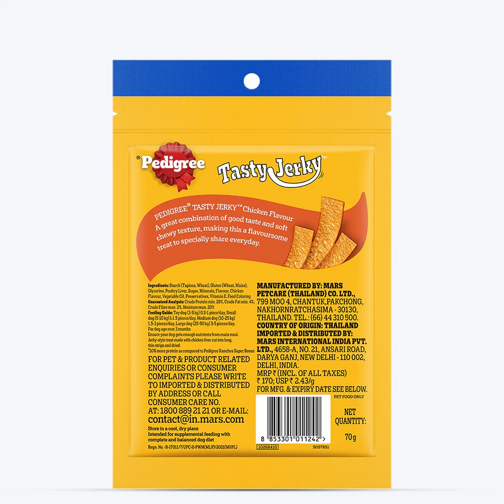 - Nutrition:Â Pedigree tasty jerky contains omega 6 & is a high-protein healthy treat (20% more protein as compared to Pedigree ranchos super bones) with low fat.