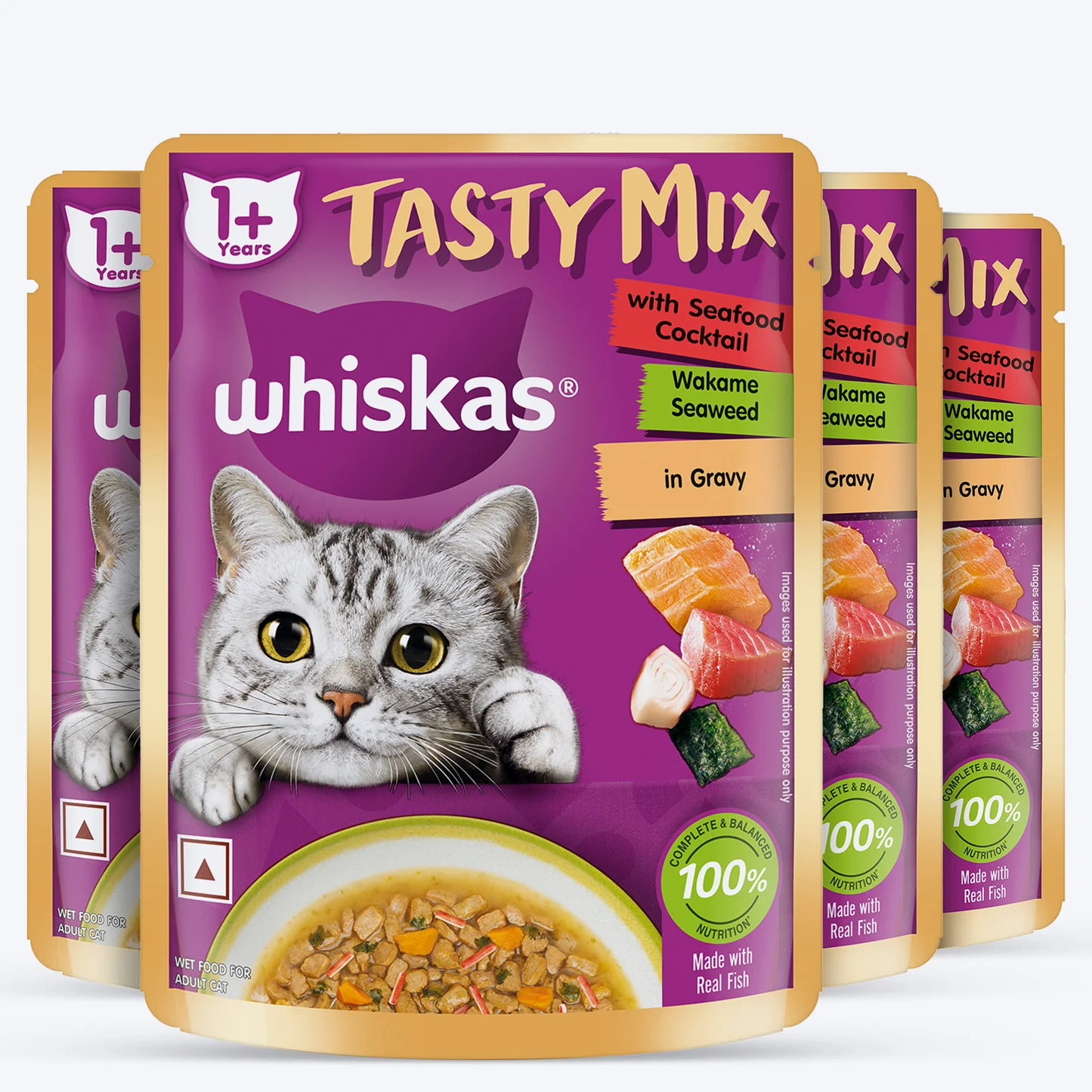 Introducing something new and tasty that is made using varieties of ingredients with complete & balanced nutrition and flavours that your furry friend will love. The new Whiskas Pouch Tasty Mix enhances the cat food deliciousness by combining quality protein with seafood cocktail wakame seaweed and nutrition from colourful veggies in tasty gravy sauce. A cat love for fish is thoughtfully blended in Whiskas cat food along with 41 essential nutrients to boost their health & energy. This is an ideal gravy food for cats that will make them happy while they also enjoy it. New Whiskas food for cat offers four flavourful varieties that they will never get bored of Seafood Cocktail with Seaweeds in Gravy, Salmon, and Chicken with Seaweeds in Gravy, Tuna, and Kanikama with Carrots in Gravy and Chicken and Tuna with Carrots in Gravy. Now turn every meal into a special meal for your fur baby. Store in a cool, dry place.